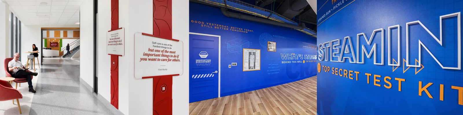 At White Castle’s home office, we created graphic elements to build excitement around their R&D test kitchen. While the kitchen itself isn’t visible to visitors, the surrounding graphics hint at the experimentation and innovation happening behind the scenes—transforming a blank wall into a brand moment.