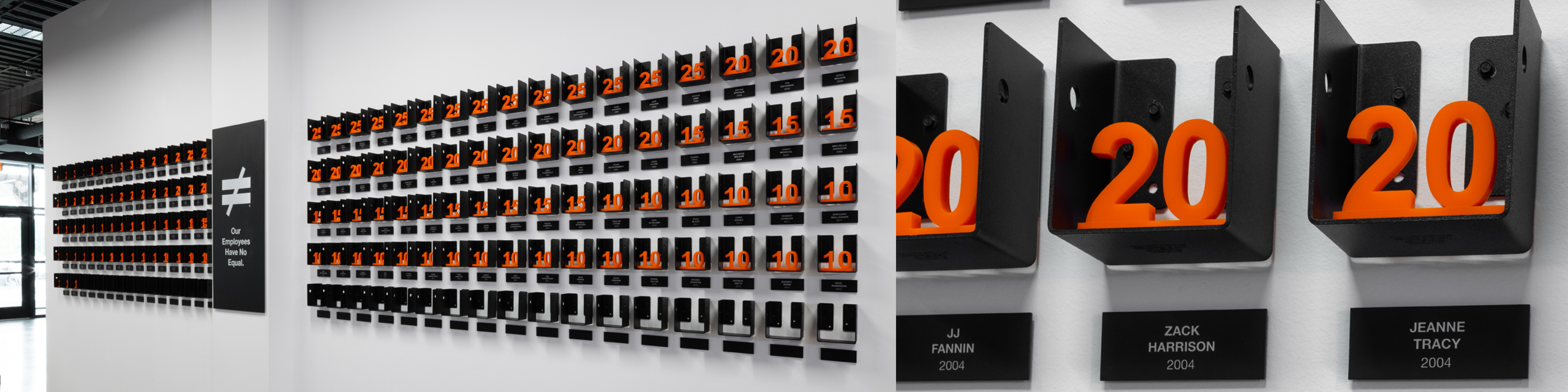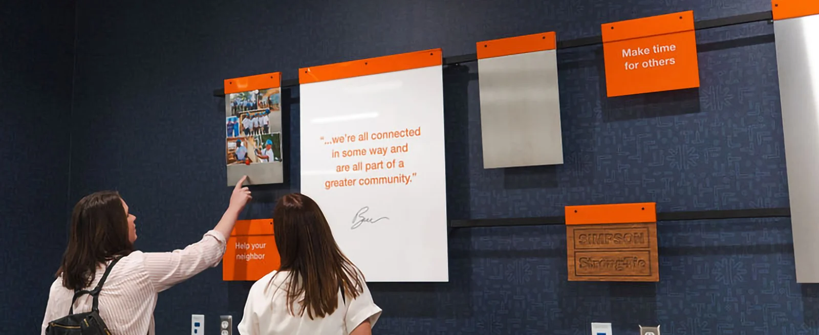 Experiential design helps recruits understand not only what the organization does, but where they could fit within it. When messaging, imagery, and energy in the space align with the people they meet, candidates gain confidence that the culture is authentic. Spaces like Simpson Strong-Tie’s offices use an interactive wall showing employee tenure to visibly celebrate growth, longevity, and individual contributions, helping recruits picture a future there. By thoughtfully placing these brand moments along interview paths and within meeting spaces, organizations can spark excitement, encourage conversation, and help candidates see the impact they could have before they ever start.