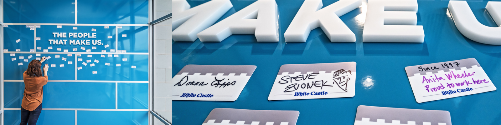 Thoughtfully placed messaging and interactive elements can strengthen collaboration, celebrate progress, and build pride in what’s being accomplished. In White Castle’s New Home Office, employees are invited to personalize branded name tags, adding their name and a message like “Proud to work here since 1997,” which magnetically attach to porcelain panels salvaged from the original headquarters. Repurposed into the team member entry vestibule of their new building, these panels honor the company’s history while giving employees a meaningful way to see themselves reflected in the space daily. These moments aren’t just decorative; they help employees feel valued, aligned, and proud of the work they do.