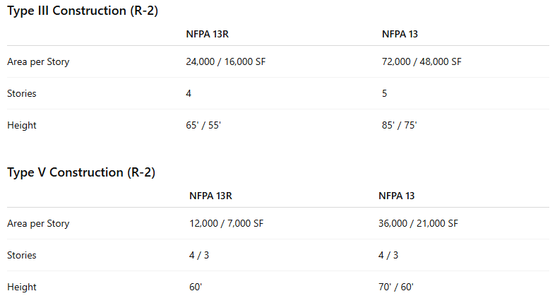 Those simple changes didn’t magically eliminate podium structures, but with the cost advantage of using an NFPA 13R sprinkler system gone, more traditional approaches requiring less gymnastics became more appealing. Type III and type V Construction, already common in multifamily buildings,once forced to use NFPA 13 system for buildings greater than 4 stories became unburdened from the height and area limitations of NFPA 13R systems. Below is a quick comparison of these construction types under both NFPA 13 and 13R.