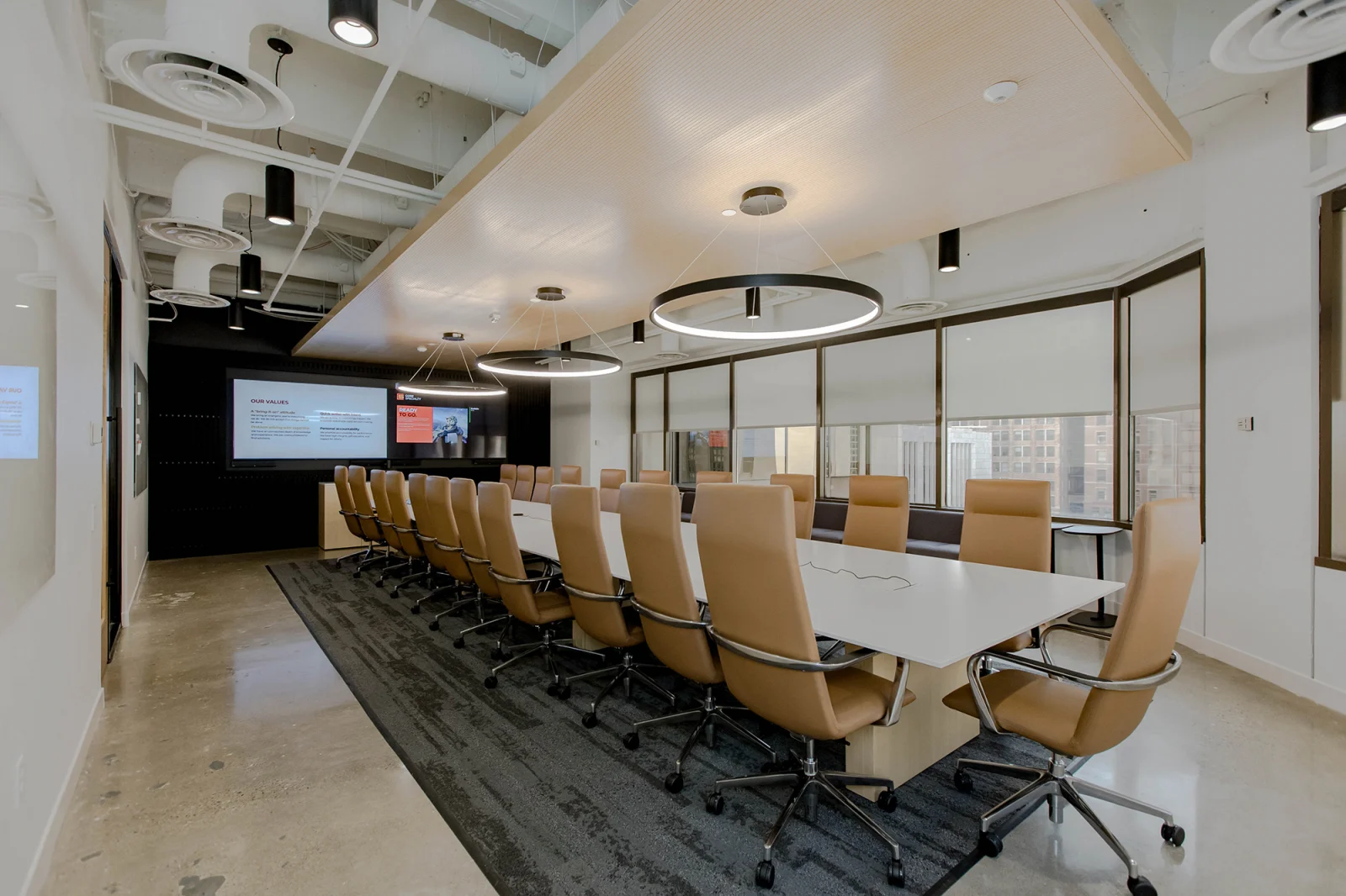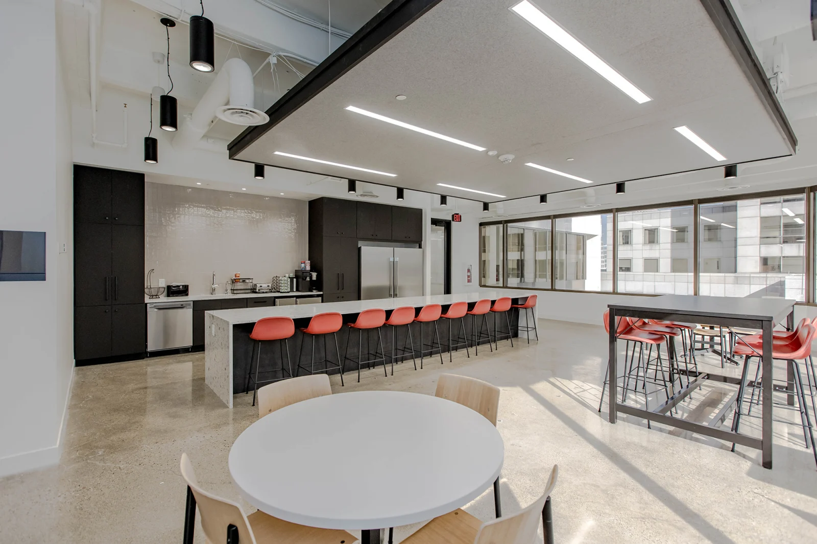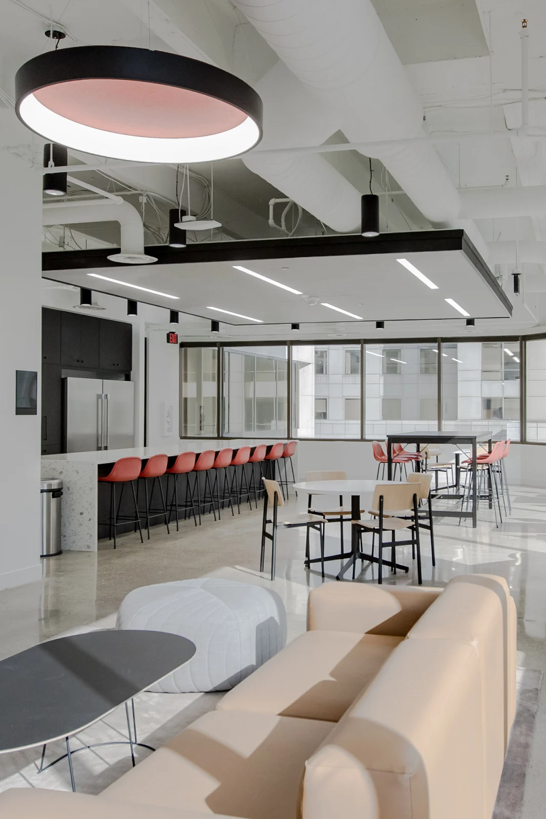 The 10th floor includes a game room and kitchenette to complement the main cafe on the 12th floor. MA also explored test fits for a future mailroom in one of the new conference rooms. The game room became a focal point for design innovation, blending playful finishes with corporate elements. To manage acoustics and define activity zones, MA incorporated LVT flooring and carpet accents with thoughtful design transitions.