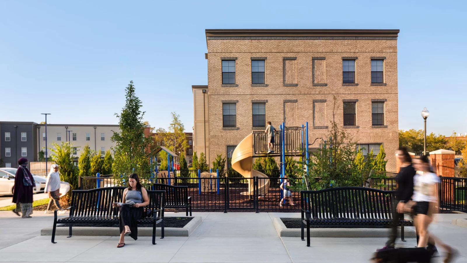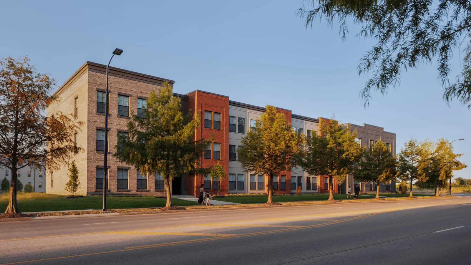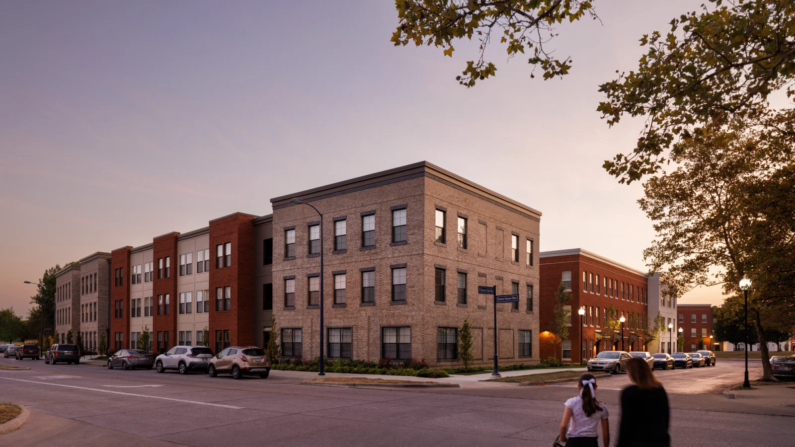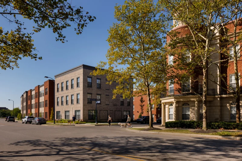 Easton Place Homes is a family centric, three-phase, affordable housing development at Easton Town Center. A total of eight buildings will form an urban village with a combination of large and small outdoor spaces all programmed for different age groups. The development will provide 200 low-income housing units near the thousands of retail and office jobs at Easton. An architectural balance of variety and consistency is important for cohesiveness with the surrounding community. The anchor buildings at the southern end of the site have an industrial warehouse character, while the architecture facing the existing market rate housing at Easton Commons are complimentary red brick townhomes.