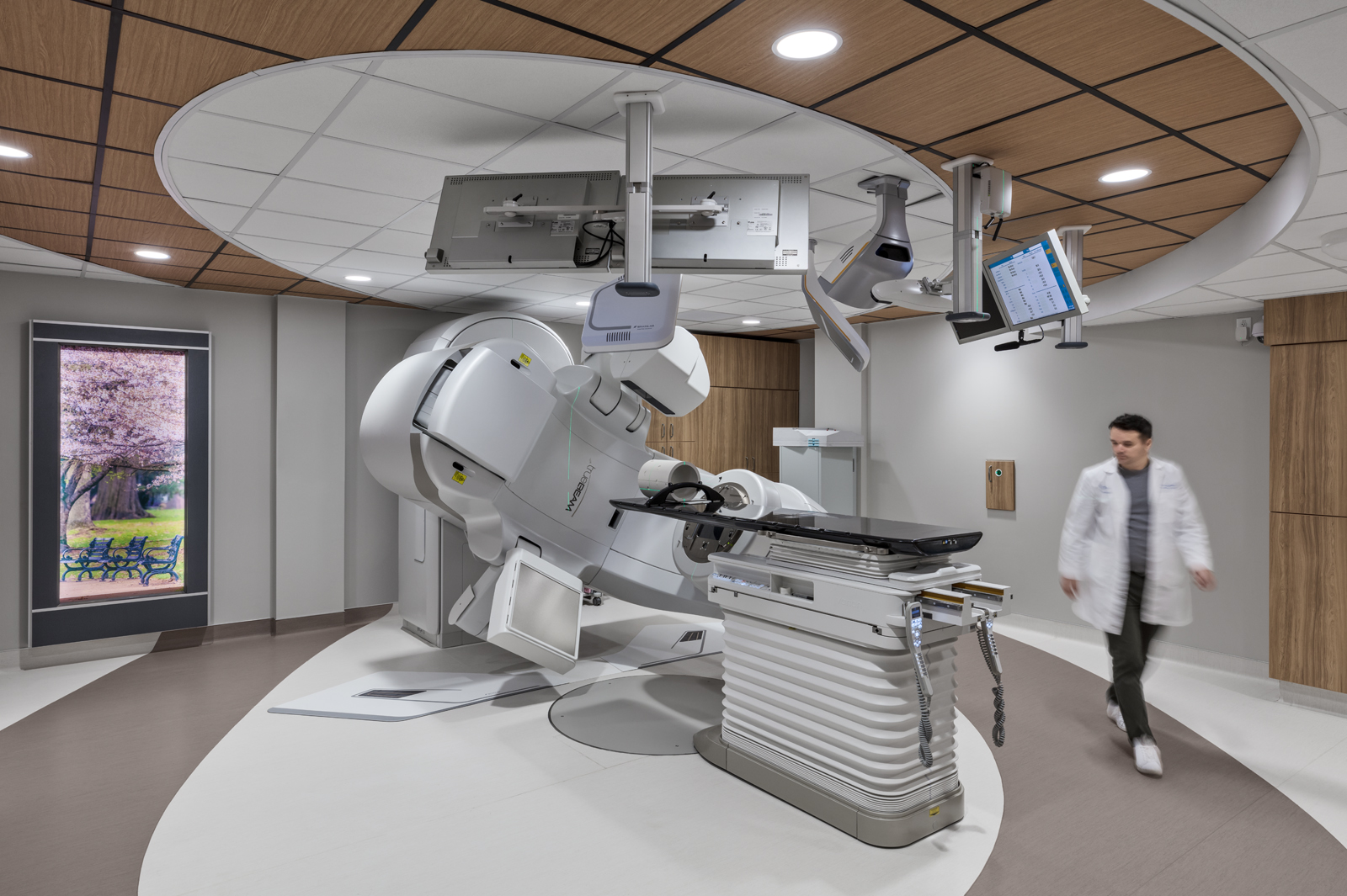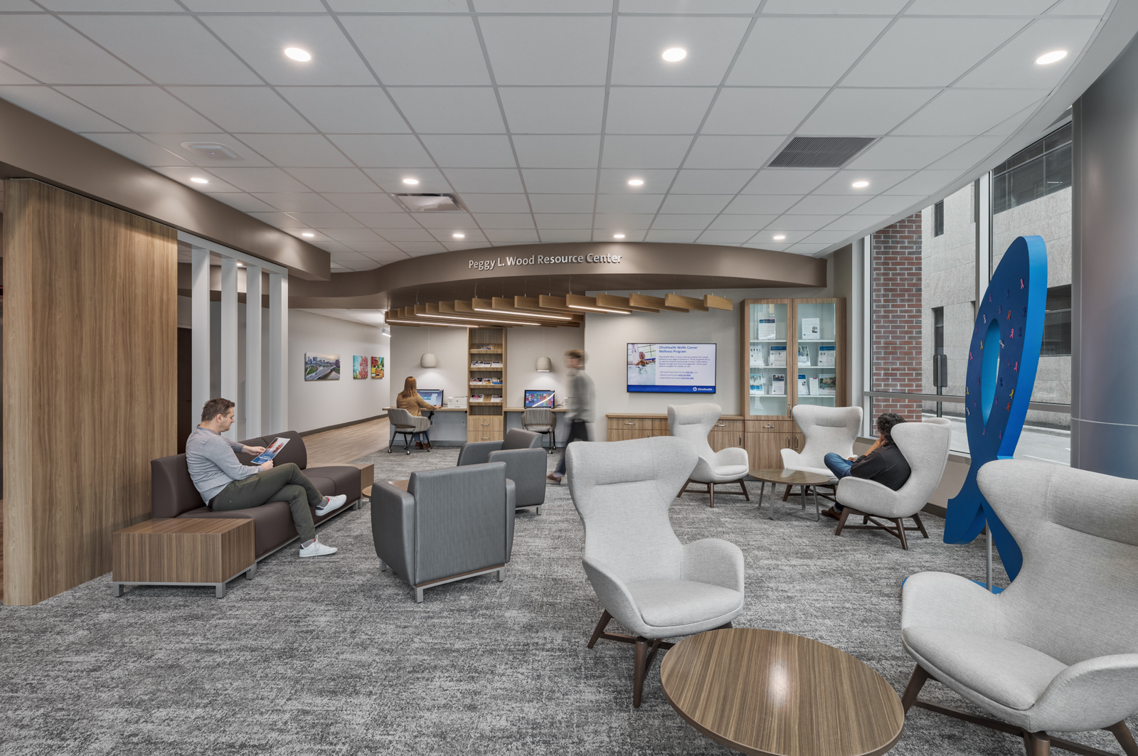 On the fourth floor a new cutting-edge infusion center, pharmacy, laboratory, and medical oncology clinic now occupy a former empty shell space. The design prioritizes co-located clinical and nonclinical spaces, fostering seamless communication and movement between off-stage and on-stage areas. Adjacencies, views, and natural daylight from exterior courtyards and garden areas were thoughtfully studied and applied to the layout of the clinic to promote patient healing, wellness, and caregiver productivity.