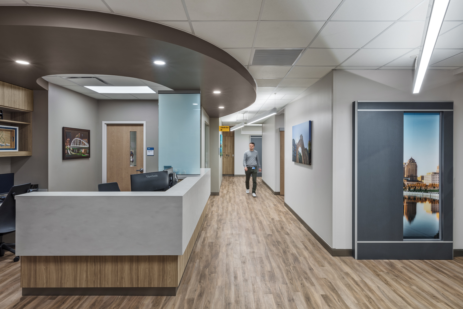 In order to better serve downtown and the surrounding communities OhioHealth expanded their oncology services at the Grant Medical Center campus to provide top-tier patient care. The existing four-story Medical Office Building was renovated and the existing parking garage was enclosed to house linear accelerator vaults, as well as a radiation oncology clinic. A new canopy drop-off area distinguishes the facility from the adjoining Bone and Joint Center Building and provides a dedicated front entrance for easy patient access and a single reception point for registration and scheduling.