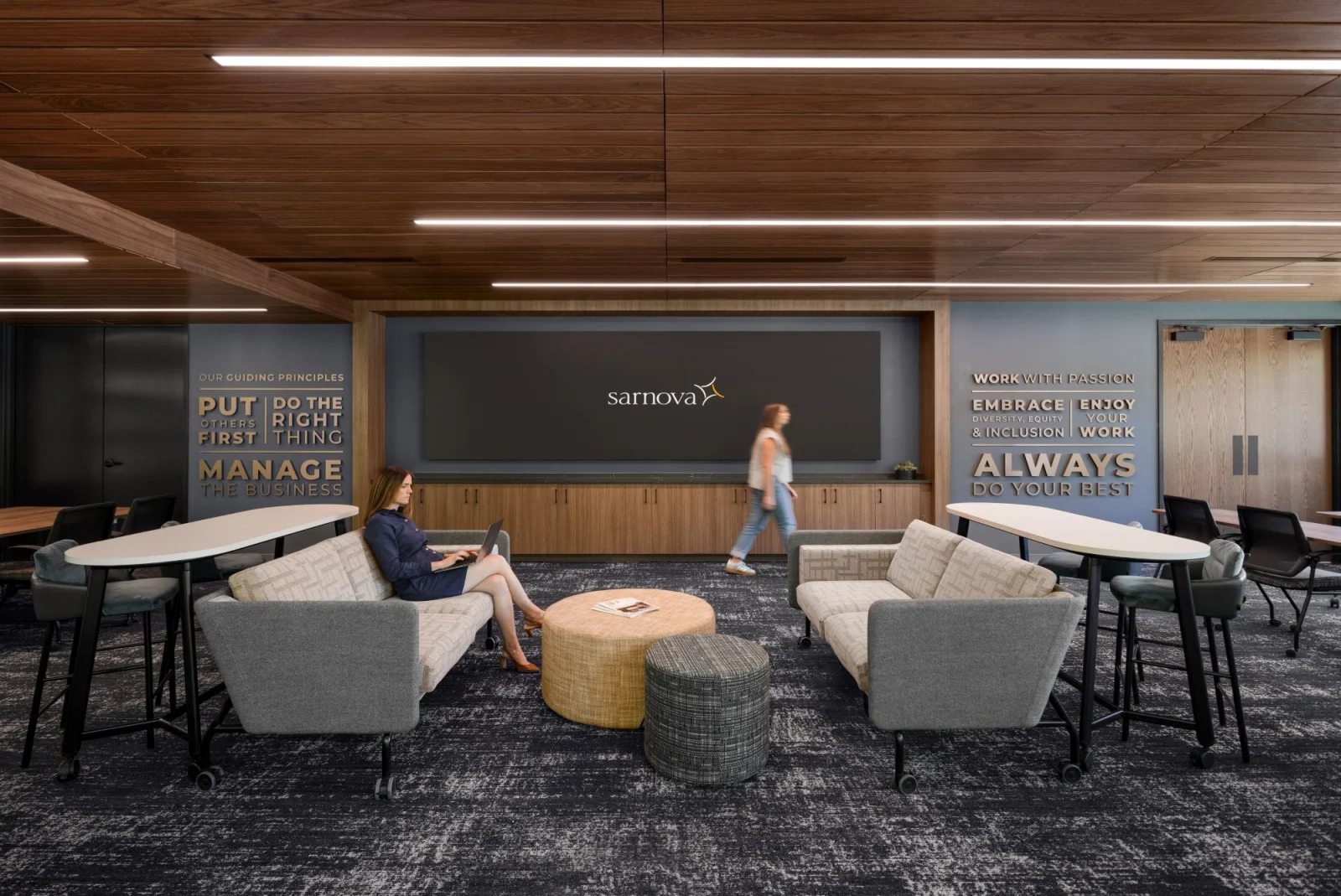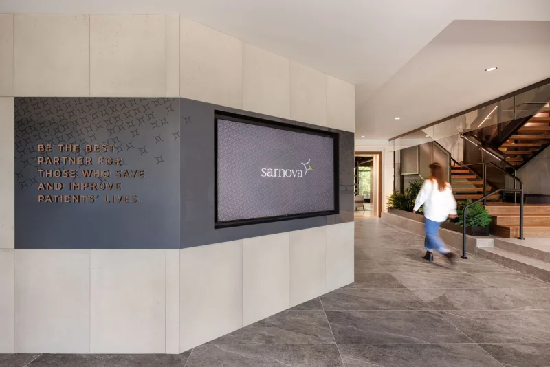 Sarnova, a national leader in healthcare and emergency medical solutions, relocated its national headquarters and used the opportunity to create a workplace that reflects its active, forward-thinking culture. Experiential design guided the storytelling approach, mapping the journeys of employees, recruits, and visitors and layering brand moments throughout the building.