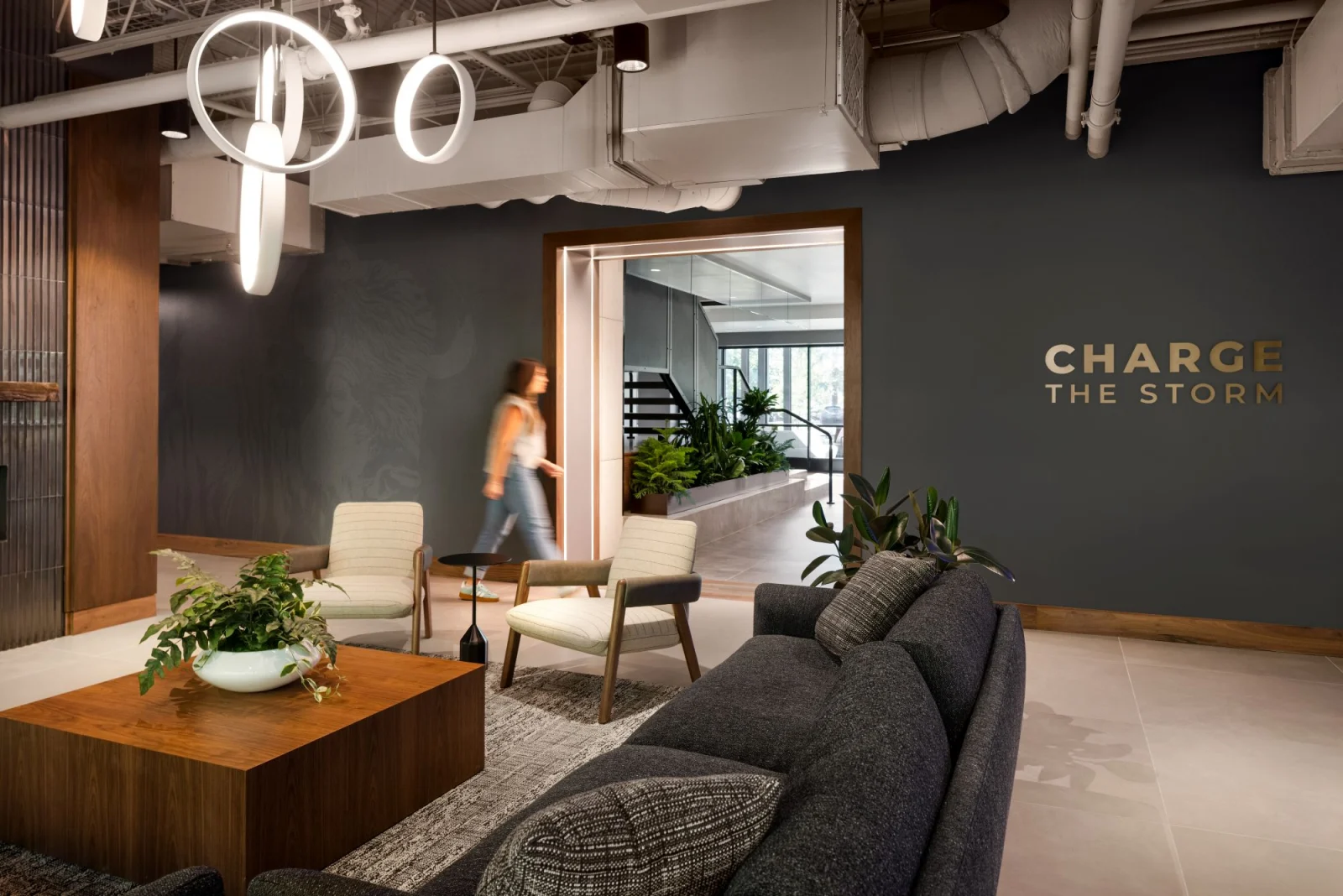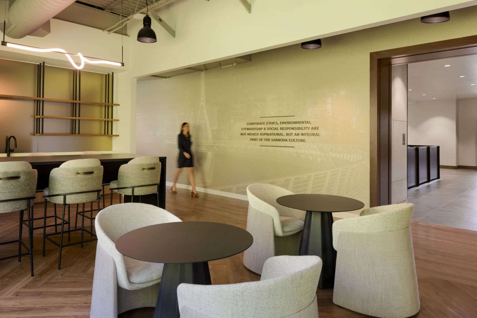 A workpolace design that brings mission and culture to life thorugh integrated materials and intentional areas.