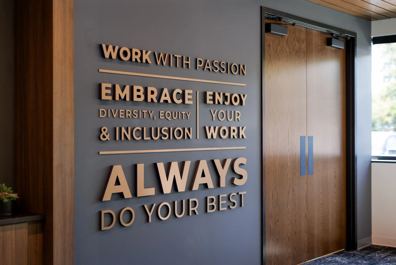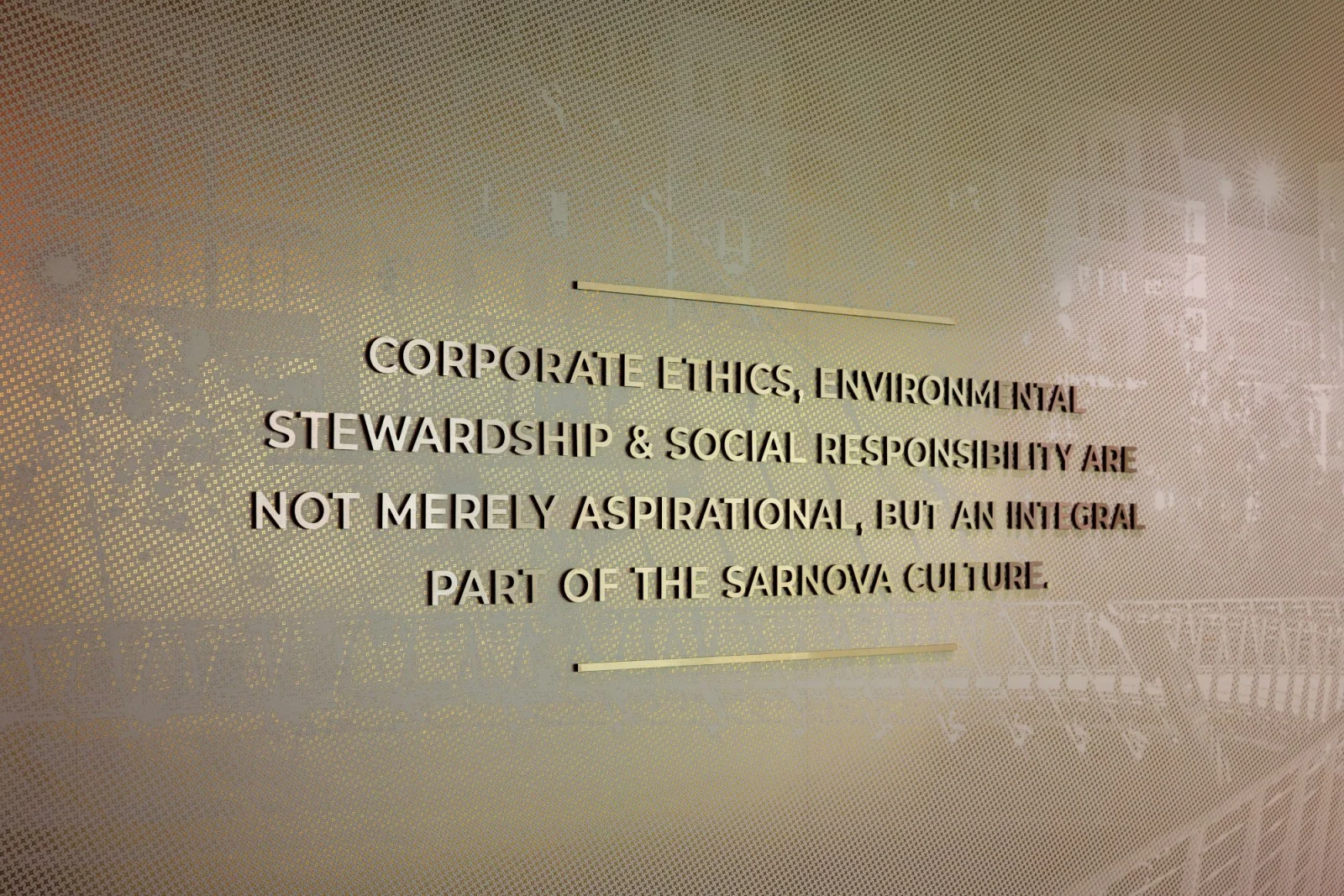 A bold entry feature with the company logo anchors the arrival experience and frames views into the main corridor, where additional elements highlight Sarnova’s goal to “Be the Best Partner for Those Who Save and Improve Patients’ Lives.” Throughout the space, storytelling elements reinforce the brand, including a custom tone-on-tone bison wallcovering with the phrase “Charge the Storm,” dimensional panels celebrating the company’s impact on patient care, and guiding principles displayed in the training room. A cohesive system of wayfinding, signage, and an exterior monument sign extends the brand experience from inside the building to outside.