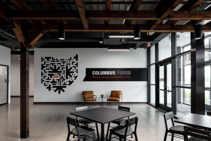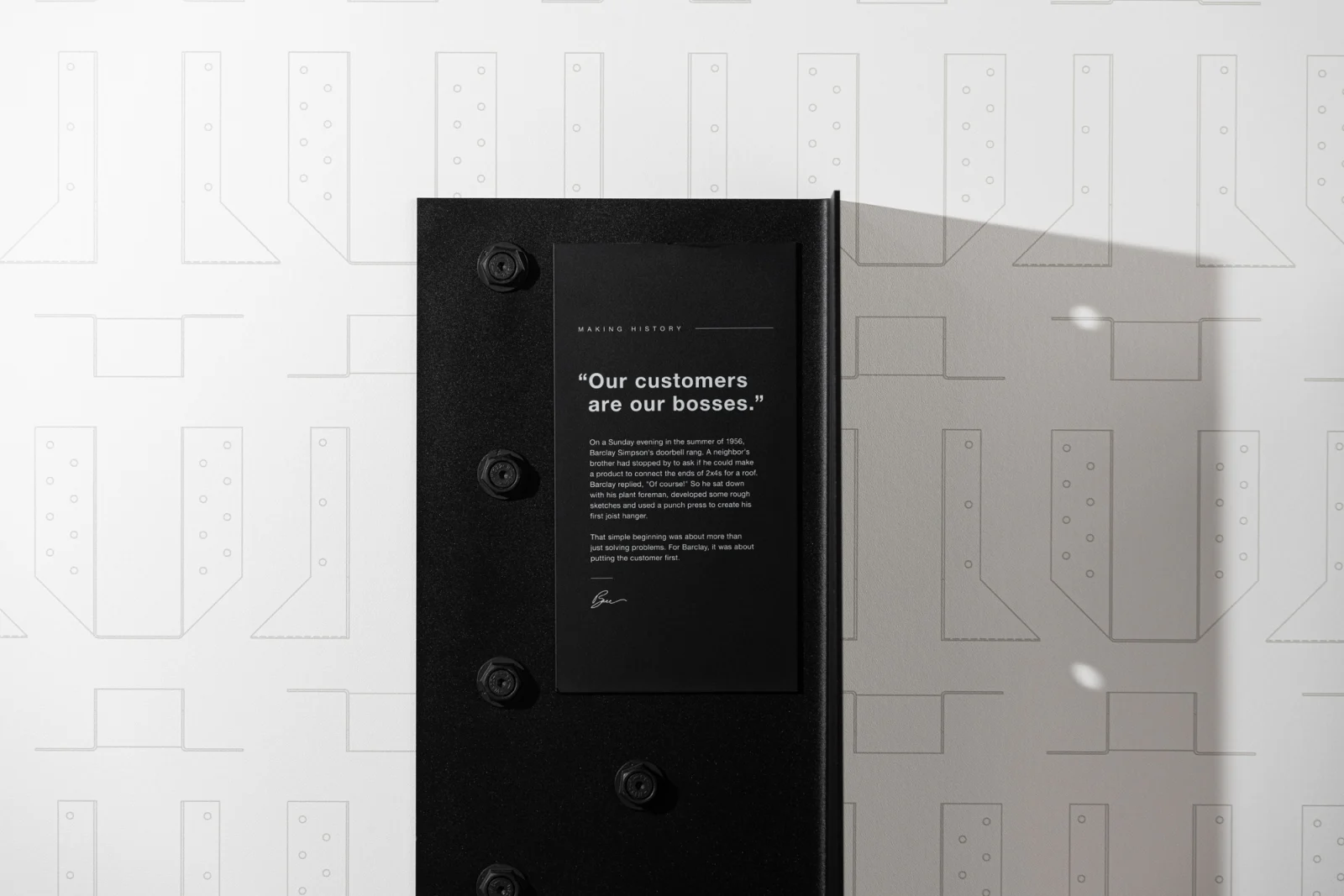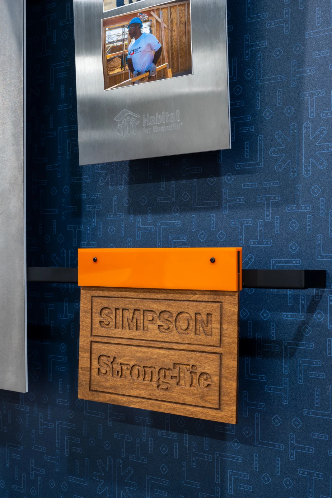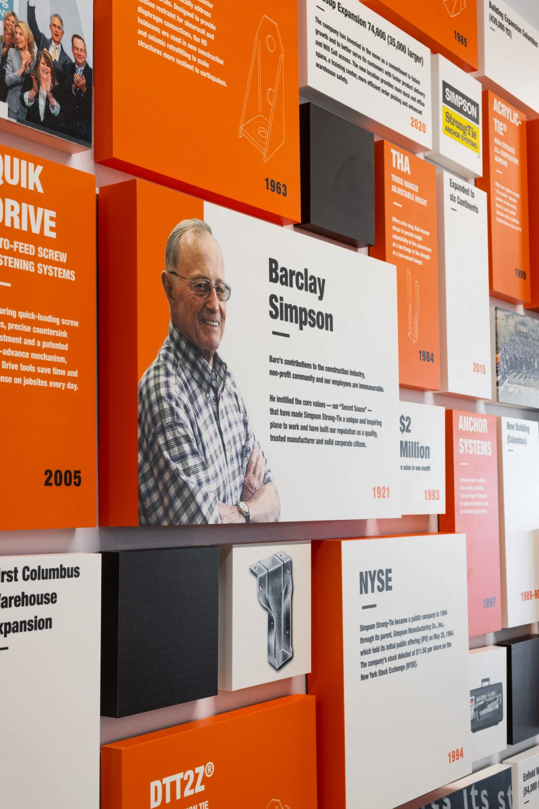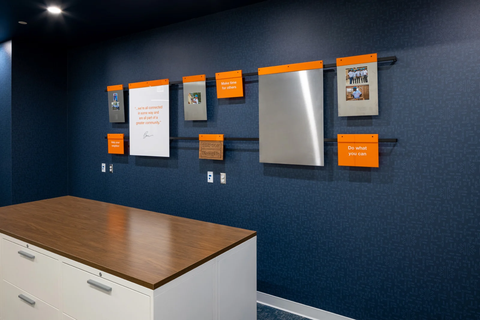 Reflecting the family-focused, creative, and fun nature of Simpson Strong-Tie, the experiential design communicates the brand and culture through their own products. Creating bold wayfinding, wall graphics, and signage through the space showcases the strength and integrity of its products and company culture. The sheer size and weight of the products presented a challenge when creating wall graphics, so extra blocking was needed to be able to support the wall hangings. Several of the new graphics honor the late Barclay Simpson, the company’s founder who passed in 2018. His innovative mindset, and his commitment to his customers, employees, and the community were second to none. Historical imagery of the early days at the factory, corporate partner displays, as well as his “9 Principles of Doing Business” messaging are displayed throughout the space.