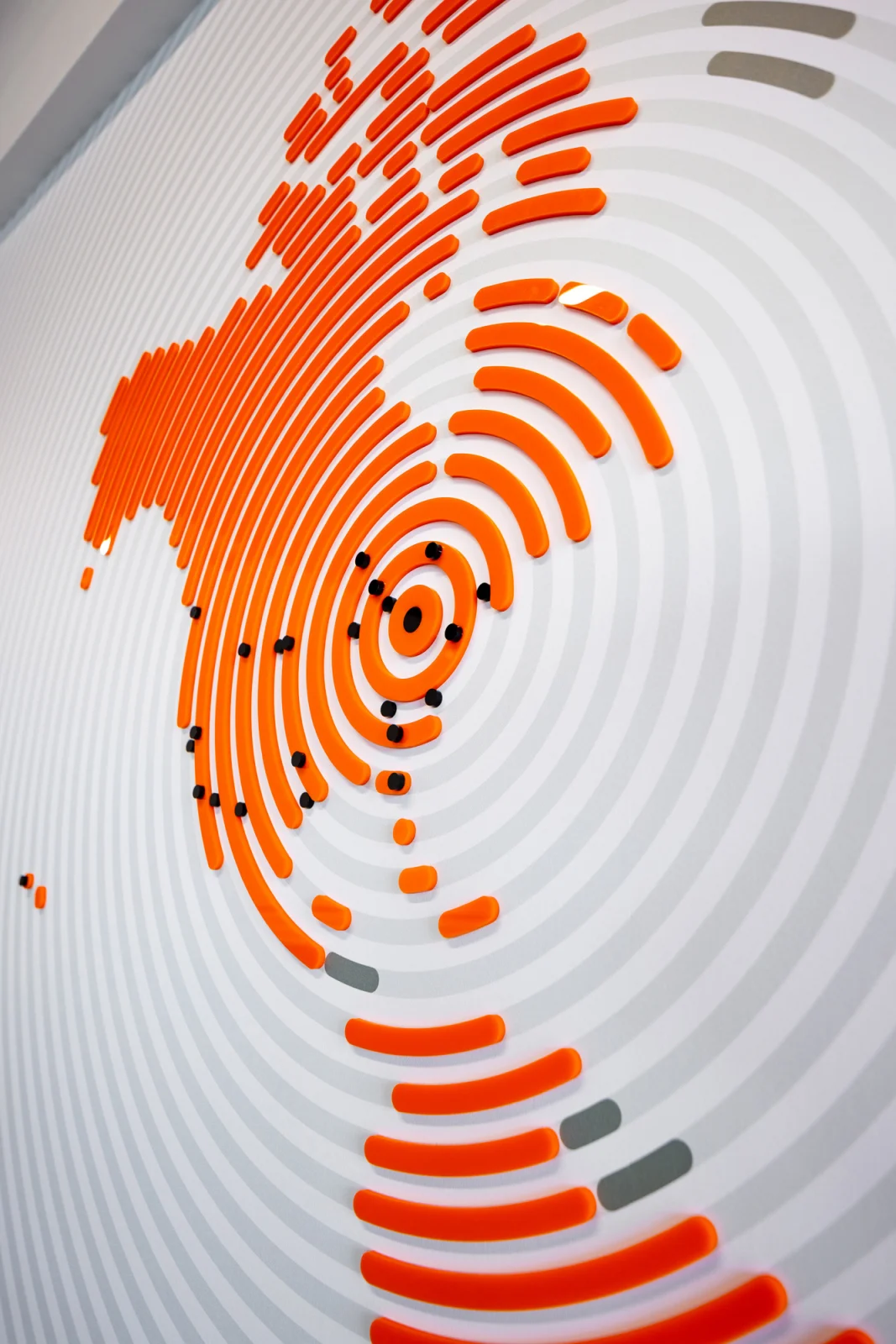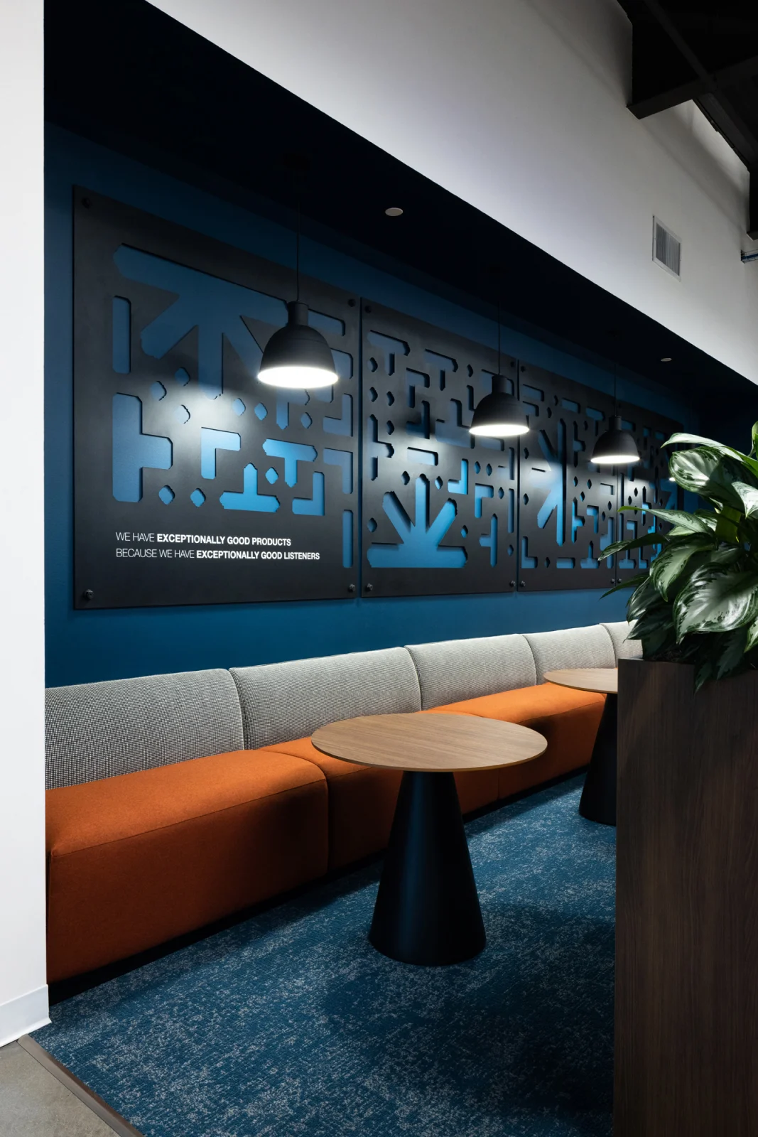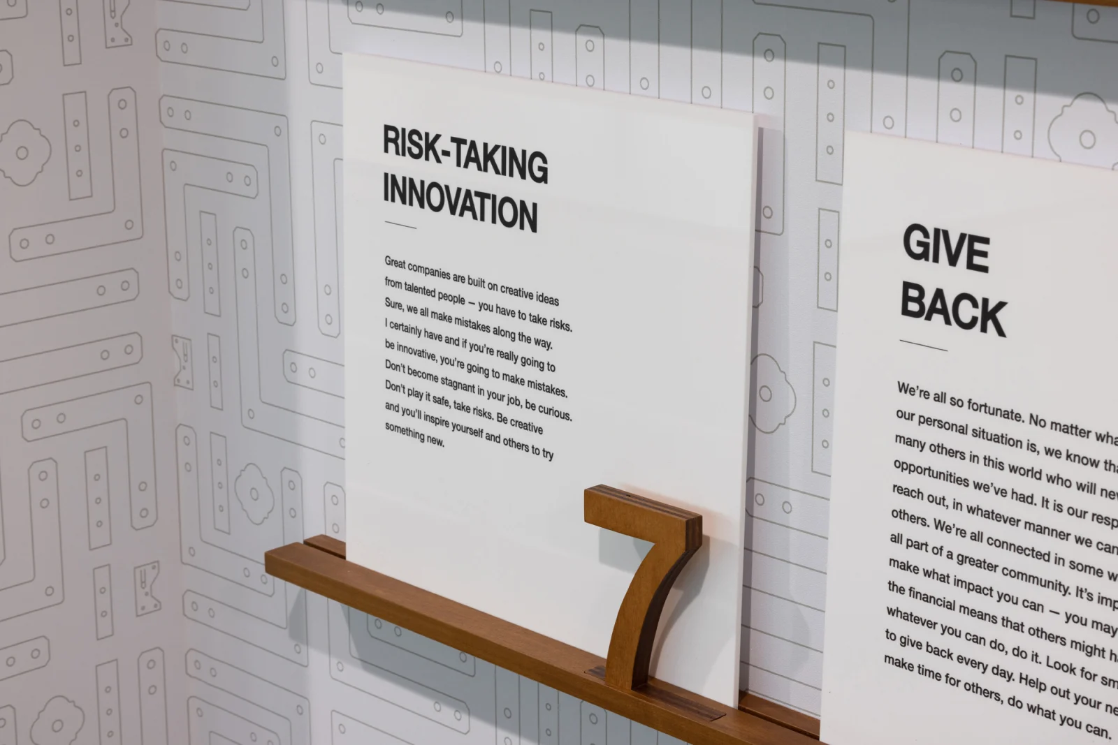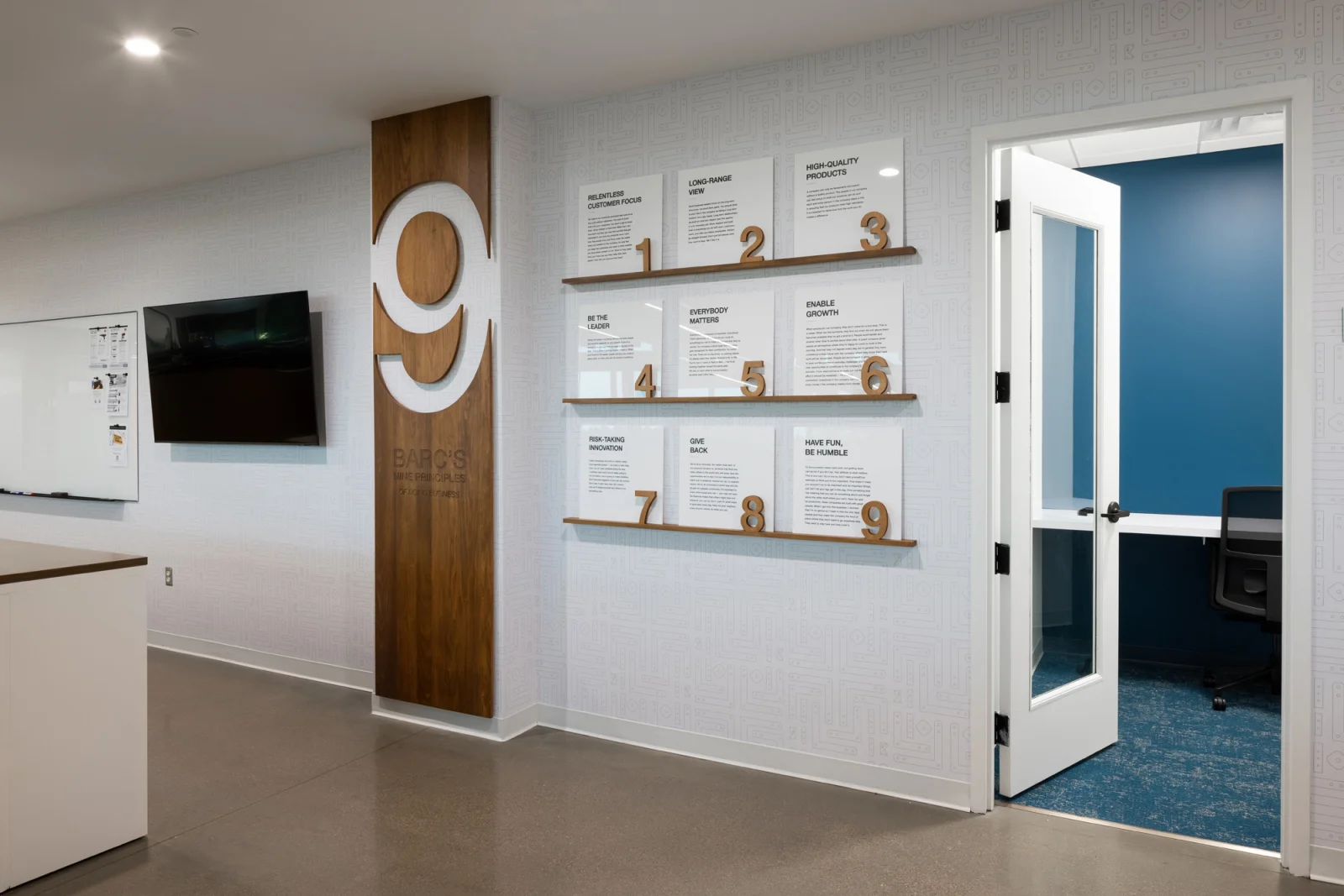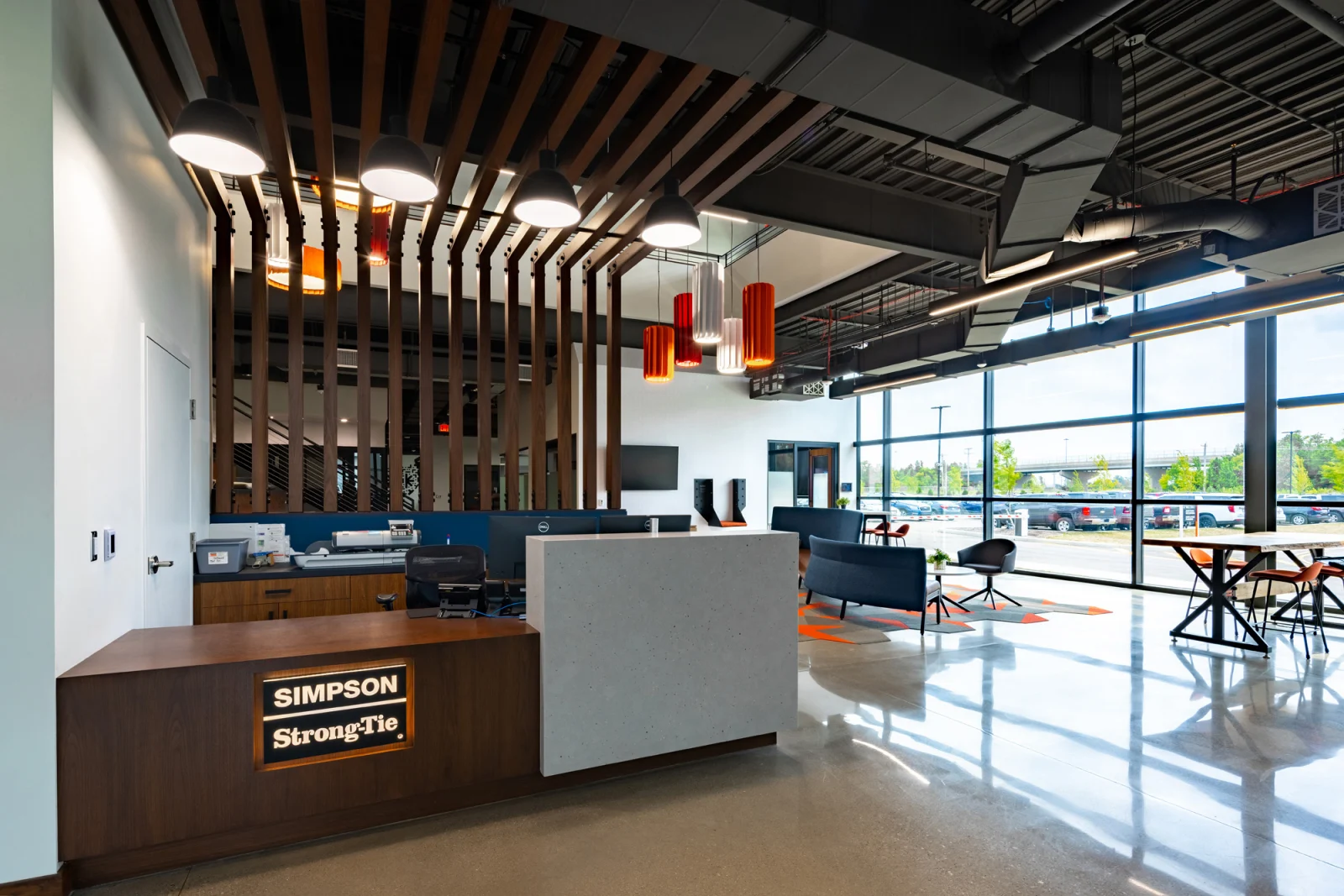 Reflecting the family-focused, creative, and fun nature of Simpson Strong-Tie, the experiential design communicates the brand and culture through their own products. Creating bold wayfinding, wall graphics, and signage through the space showcases the strength and integrity of its products and company culture. The sheer size and weight of the products presented a challenge when creating wall graphics, so extra blocking was needed to be able to support the wall hangings. Several of the new graphics honor the late Barclay Simpson, the company’s founder who passed in 2018. His innovative mindset, and his commitment to his customers, employees, and the community were second to none. Historical imagery of the early days at the factory, corporate partner displays, as well as his “9 Principles of Doing Business” messaging are displayed throughout the space.